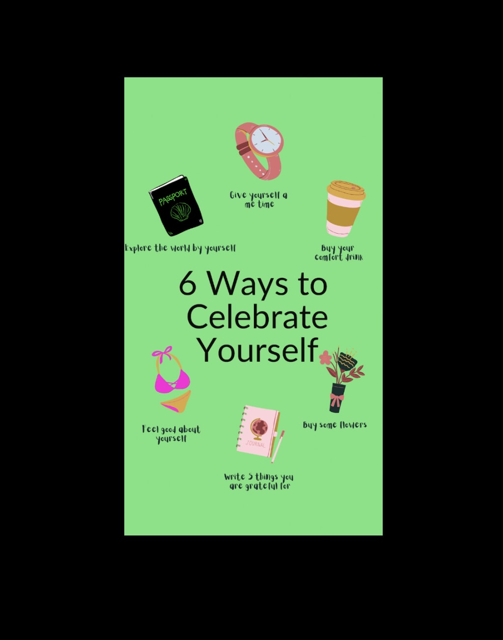 4) Spend some time with yourself: Start to search within, learn your likes and dislikes, your triggers, what really drives you. The biggest part of learning to love yourself is accepting ALL parts of you. Never, ever and I mean ever speak down on yourself. For example: maybe you’re a people pleaser, instead of saying I hate how I always do things for people switch your mindset to I am invested in the people around me, although helping people is a good thing I realize I over extend myself and need to help me first.