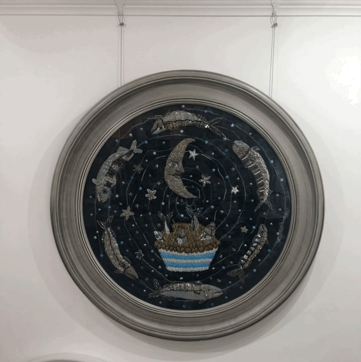 I spent my first day in my studio, sewing in the sunshine, finishing my Stargazey Pie, the piece that brought me so much joy and tranquility a year before. I stitched the final bead down and snipped the last thread with a flourish. I stood back to see what I had made. Stargazey Pie was finally complete. It dazzled in the sunshine and made my heart warm to see it finally finished.