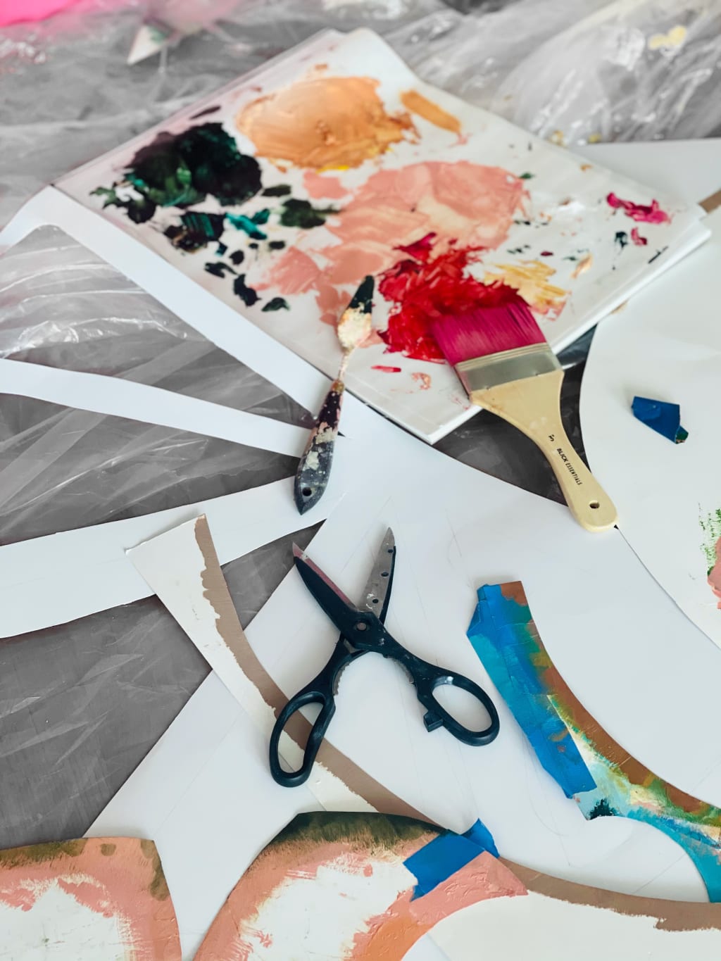 Especially after spending a year inside during quarantine, I’ve become very connected to nature and the feminine aspects of life. Mother nature is healing and inspiring. Many of my inspirations for my artwork come from long strolls in nature along the ocean or in the forest. I frequently spend time outdoors in South Florida, where the native flora and fauna is sublime. The rich seascape provides a natural solace where the ocean breeze renews and reinvigorates the senses to clear the mind. An empty mind is a fertile vessel for artistic insight. The solace and silence of nature promotes harmony in the human thought process, and allows the mind to wander in a meditative state. Nature is my greatest inspiration, and several of my color palettes come from the miscellany of flowers, leaves, butterflies, and bird feathers I discover during my time outdoors. That natural beauty is part of what inspired me to design my latest series of work. My latest series utilizes scissors to cut out stencils and patterns to create sharp, clean painted edges for various shapes, adding layers of depth and dimension to my artwork. In my creative process, I use textured poster board perforated throughout with wavy cutouts that you might just mistake for leaves. The fact that a scenic walk enveloped in lush flower petals aided the creation of my latest painting might account for the deep shades of fuchsia and magenta pink.