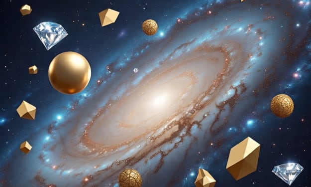 In the boundless theater of the cosmos, where stars twinkle like diamonds against the velvet darkness of space, a mesmerizing spectacle unfolds. "Cosmic Glitter: A Galaxy of Dreams" is a breathtaking vision of a spiral galaxy, alive with the interplay of celestial wonder and geometric fascination. This captivating scene transcends the ordinary, weaving together the grandeur of the universe with the elegance of shapes that defy gravity. At the heart of this cosmic ballet is a majestic spiral galaxy, its core a radiant beacon of light that illuminates the swirling arms of stardust and mystery. The galaxy's hues blend in a dance of beige, blue, and brown, painting a canvas of awe-inspiring beauty across the vast expanse. Surrounding this stellar masterpiece are geometric marvels—golden spheres, multifaceted polyhedrons, and glittering diamonds—floating as if suspended by the invisible threads of dreams. These shapes, varying in size and intricacy, add a surreal dimension to the scene. Some are smooth and lustrous like polished gold, reflecting the distant light of stars; others are sharp and crystalline, sparkling like gems in the cosmic night. Among them, a few bear the texture of a brain's complexity, hinting at the mysteries of thought and creation in the universe's grand design. The interplay of light and shadow on these shapes creates a dynamic rhythm, as if the cosmos itself is celebrating the harmony of form and space. As the eye travels through this dreamlike expanse, the contrast between the organic flow of the galaxy and the sharp precision of the geometric forms evokes a sense of wonder. It's as if the universe has invited geometry to a masquerade among the stars, where rules of physics blend with the whimsy of dreams. The background, a deep navy blue peppered with stars and hints of distant nebulae, grounds the spectacle in the reality of space while allowing the imagination to soar. In "Cosmic Glitter: A Galaxy of Dreams," every element whispers a tale of balance and beauty. The golden shapes evoke luxury and timelessness, the diamonds speak of brilliance and rarity, and the textured spheres hint at the complexity of existence. Together, they orbit the galaxy like attendants to a celestial queen, each contributing to a narrative that is both poetic and profound. This vision is a reminder of the universe's infinite capacity to surprise and inspire. In the vastness of space, where galaxies are born and stars die in spectacular fashion, there exists a beauty that mingles the mathematical with the mystical. "Cosmic Glitter" captures this essence, inviting viewers to lose themselves in the grandeur of a galaxy adorned with geometric treasures, floating in the silent music of the cosmos. As one lingers on this image, the boundaries between science and art blur. The scene becomes a metaphor for dreams—where the logic of shapes meets the illogic of space, where light plays hide-and-seek among the stars, and where every glance reveals a new facet of wonder. In the end, "Cosmic Glitter: A Galaxy of Dreams" is not just a view of the cosmos but a glimpse into the dreamscape of the universe itself, a place where beauty is law, and wonder is the currency of existence.