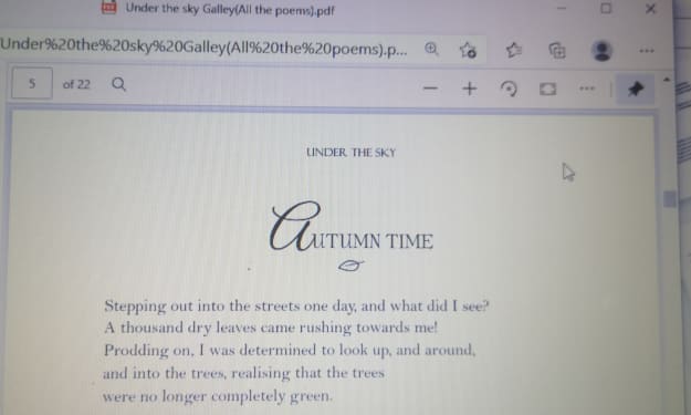 Start writing.. The project 'Under the sky' has been a real inspiration to me. I began working on it due to my strong love and admiration for nature as well as my love for writing poetry. The word nature here refers not only physical features and natural resources of the earth, but also human nature. I usually love to spend time observing nature, especially during my spare time,so shortly after brushing up on my writing skills a bit , I got going with a few poems, thus, I came up one day with the idea to do a full collection of poems, which I later called 'Under the sky'. In my opinion, it is a wonderful anthology of essential poems.