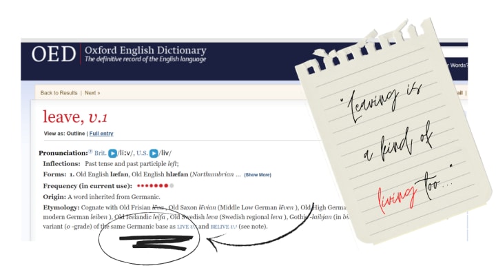By no means am I an expert at the craft of leaving, much less leaving well. I have made my share of messes (and perhaps more) leaving people, jobs, passions, hobbies, friends. And while I could go on here about all the backstory that led me to this moment, I will instead stick to just those few stories about leaving, how I learned that leaving is not what we think it is - an etymological lesson learned and shared here about the art of leaving and leaving well.