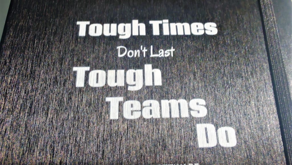 My father was given a small black notebook when he started his career. He never opened it, never once wrote a word in it. Every day I’d walk past his desk, where he sat diligently – creating solutions where no one else could find them. Every day I’d notice the little black notebook, emblazoned on the front with the words “Tough times don’t last. Tough teams do.”