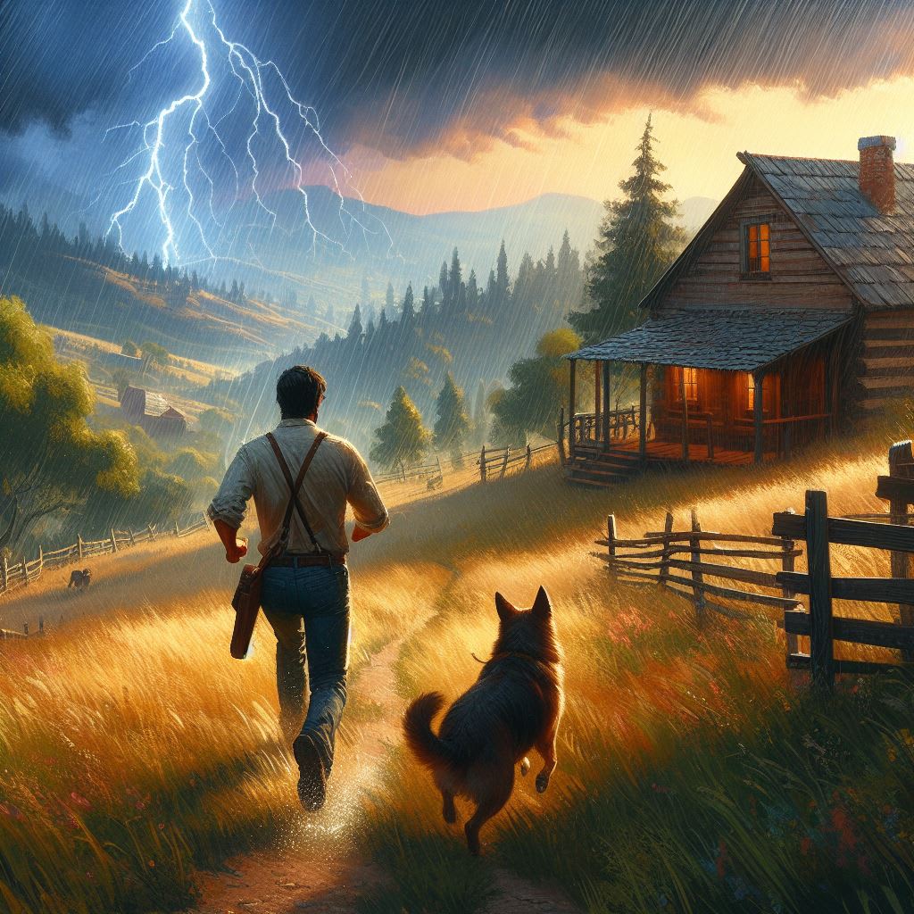 With a sense of relief, they pushed open the door and stepped inside, escaping the relentless downpour that raged outside. The interior of the cabin was dimly lit by a flickering lantern, casting long shadows against the wooden walls. Goldie shook himself off, sending droplets of water flying in all directions, before curling up on the threadbare rug in front of the fireplace. Mr. Smith followed suit, shedding his soaked outer layers and stoking the embers in the fireplace to life, filling the cabin with a warm, comforting glow.