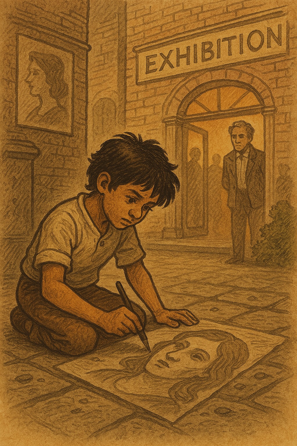 Mr. Roy, the famous artist, happened to walk past the gallery and noticed Ayan’s work. He was taken aback by the boy’s skill. The raw emotion and detail in the sketches were unlike anything he had seen. Intrigued, Mr. Roy approached Ayan, who was so absorbed in his art that he didn’t even notice the man standing next to him.