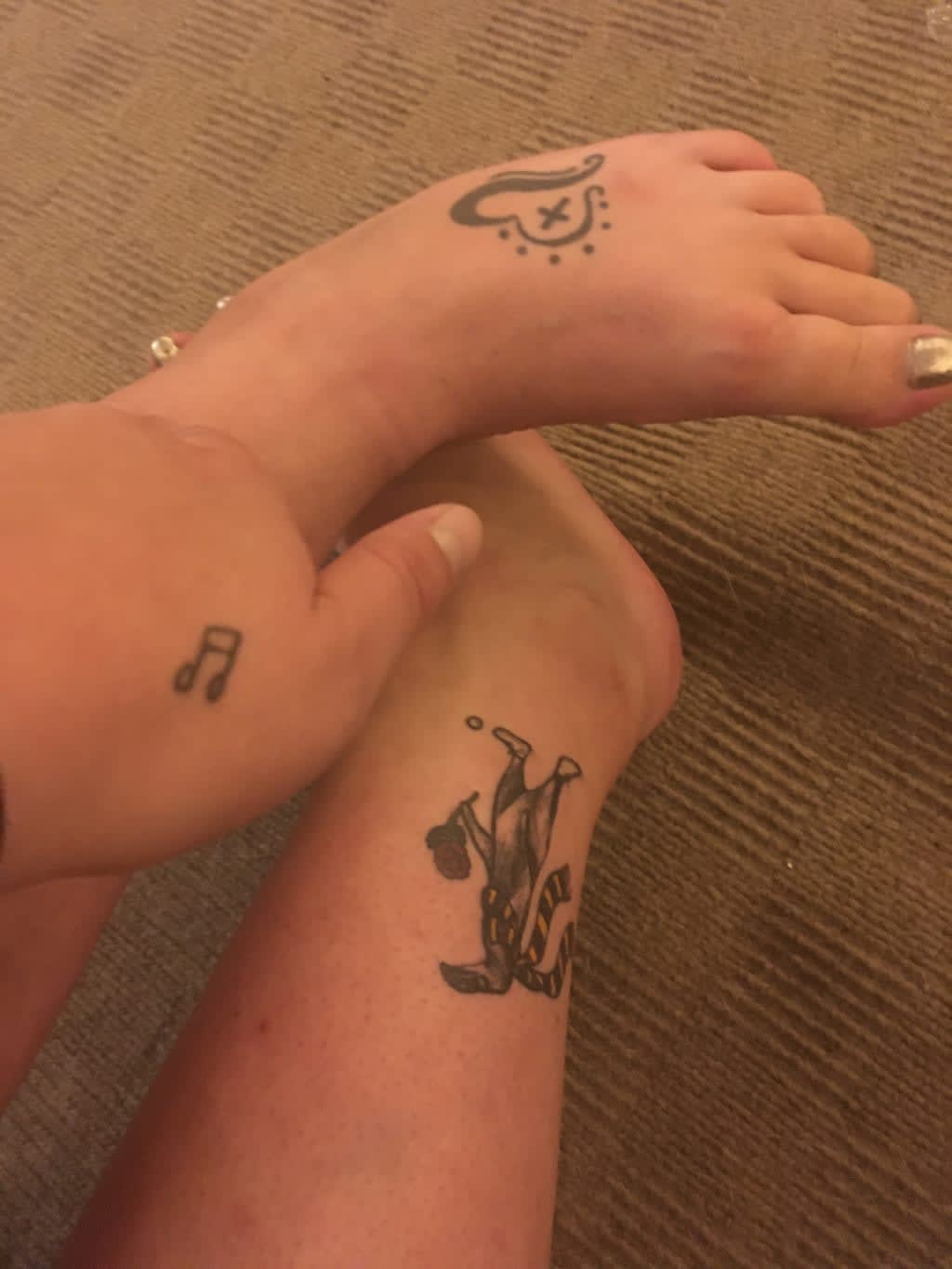 When I was 16 in highschool; I had asked my mom about what she thought of tattoos. She didn’t like them and told me that if I ever did get one that I had to have meaning behind it. While in school; I was diagnosed with depression. Since I did want a tattoo; I decided that I would design one that had purpose and meaning behind it. I believe that a person has two sides of their body; the left side is the flow of your heart and what you believe in. And the right side is where you draw your strength from; where you came from and grew up with. It’s your grounded side. So I designed a tattoo to be on my left foot; so that whenever I felt depressed; or I wanted to do something harmful to myself in any way; that when I looked down at the ground and saw the back of my feet; I would have a reminder to look back up and keep my head held high. I wanted to incorporate my belief; and a reason to keep breathing. So I have a heart that can be connected into an infinity sign; with six circles on the outside of one side of the heart (circles are continuous; therefore represents the six days of the week) and a cross on the inside of the heart to represent God and the seventh day as Sabbath. This tattoo was my first tattoo of three; my second tattoo is on my left hand as well. I believe that if you love music; then it’s a type of air that keeps you alive; keeps you breathing, and steady. I didn’t want to just “follow the crowd” and get “music = air” written in cursive on my arm. But when I got bored in high school; I used to draw a music 🎵 note on my the top part of my left thumb; and would draw it in pen every day to the point I was getting a stain there and people would be asking me if it was real. In 2016, five years after my first tattoo; I went and got it done on my hand finally. So when you cover both notes; the middle of the note is blank to represent the “=“ sign; and the rest of the notes are not filled in to represent the “air”. My last tattoo is on my right ankle. It’s a cartoon character from the early 1930’s dark artist era Edward Gorey. The character is from his book called “The Doubtful Guest.” My late grandmother enjoyed this cartoon very much and told me it reminded her of a child growing into a teenager and coming into a house and destroying it for 18 years. This character on my ankle is also holding a rose in representation of my other late grandma whom loved to garden and roses were her favorite flower. The scarf on him is in representation of my mom and myself as we enjoy the Harry Potter series; and the small ball is a golf ball to represent my father and grandfather whom both loved to play. They are on my ankle because without an ankle you have no support; and they are my support system; the roots to my being. I hope you enjoyed these tattoos as I have creating them. My father recently passed two days after my birthday last month and I plan on getting his last voicemail on my right inner arm of a sound wave of his voice. It’s the last time I heard his voice before ALS took it away from him completely.