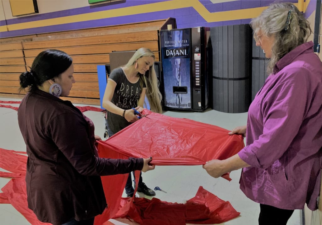 In 2018, I did another set of 4 fence panels installed in my hometown of Lead, SD. These two installations helped me move the project forward and connect to 6 different communities across South Dakota over the past 4 years. In 2019, the third summer of Linking Fences, I was able to build a team and work in 3 communities weaving hands and hearts together as community groups cut through fabric and raw materials to prepare. One of my artist assistants is a hot air balloon pilot and through her networks, she acquired for the installations every color of hot air balloon fabric in the rainbow including black and white too!