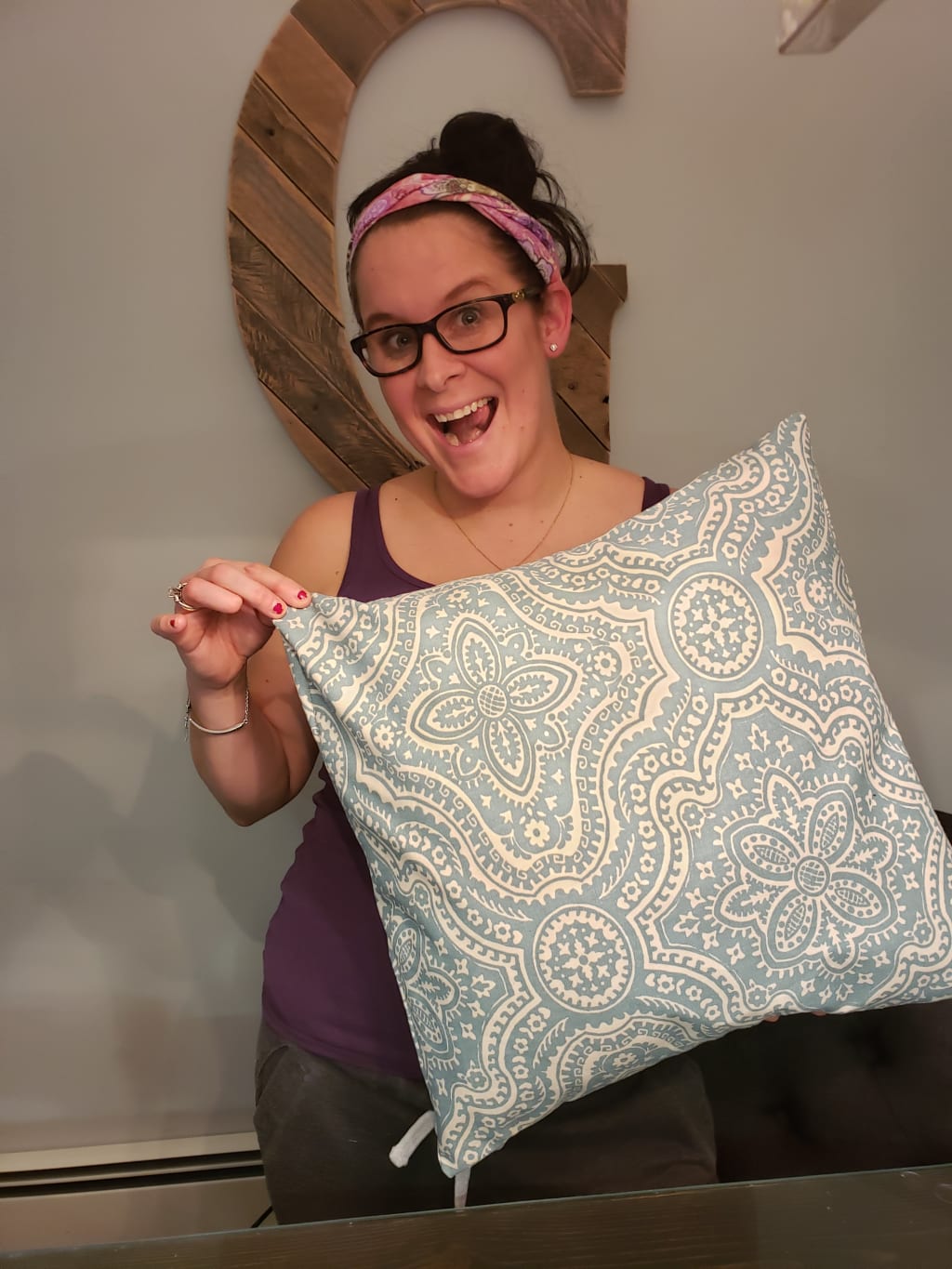 I decided that the first thing that I would make is a throw pillow. How hard could it be? It’s two pieces of fabric in a square. I can handle a square; I just threaded this beast of a machine and I’m feeling like I can conquer the world. As far as my ego was concerned a square had nothing on me. Turns out, a square had everything on me. I laid out my turquoise and white fabric, measured the 18-inch squares and cut it beautifully with my brand-new Fiskars. I pinned it all in place and lined it up on the machine. I was sitting pretty tall at this point. Successful step after successful step had led me down the path to a false sense of confidence.