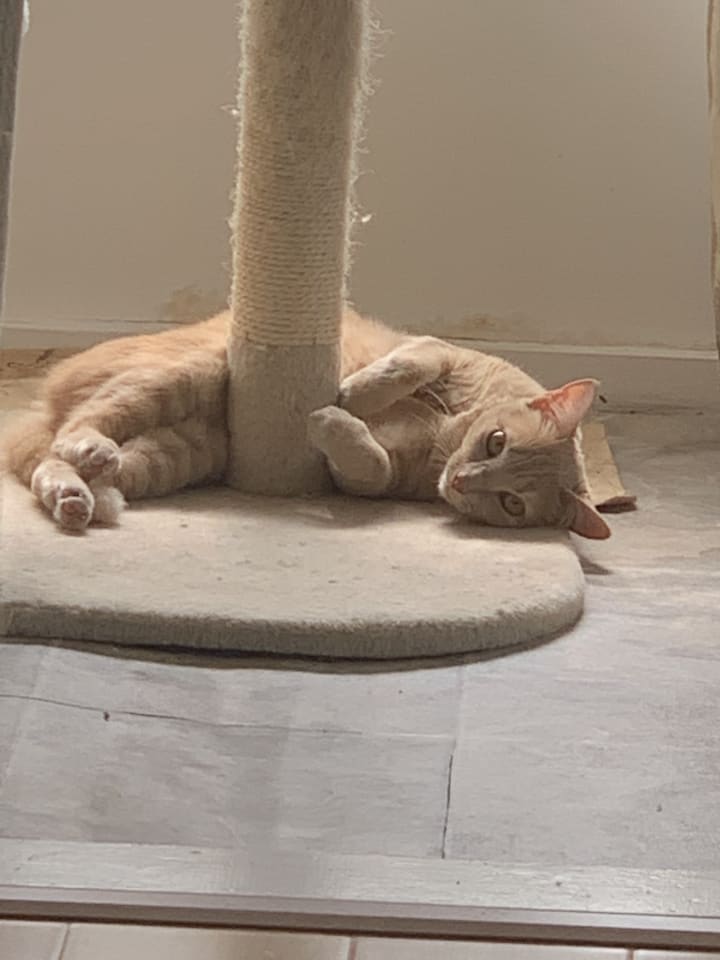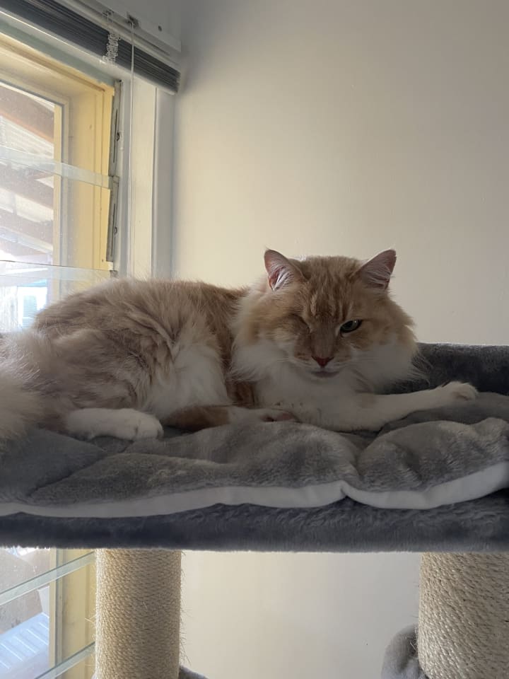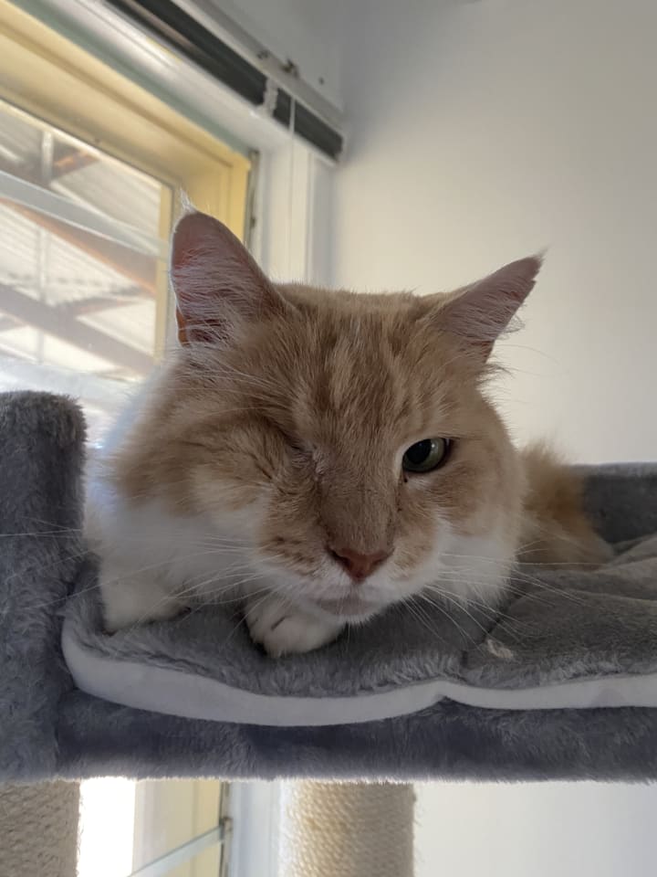 I must note here that Peach is disabled. You may have noticed, when I commented on his gorgeous eye, that this was a singular word. Peach has lost one of his eyes but please do not allow this to influence your decision on EmPAWyee of the Month. Peach is as good at his job as any two eyed EmPAWyee would be.