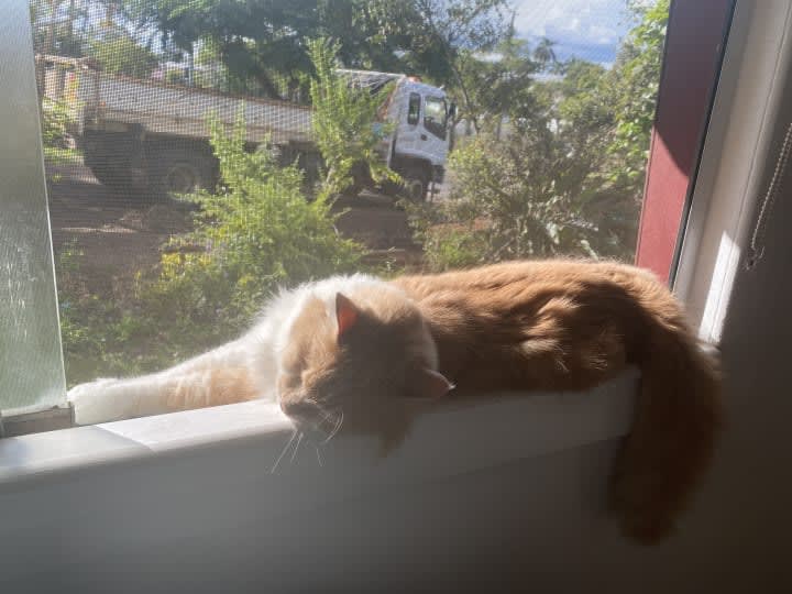 Up I stumble and go looking for Peach. Once found, perched below the closed lounge room window, gorgeous eye - and no there is no case for workplace sexual harassment as I’m just stating the obvious - silently requesting the window be opened. It’s now time for him to ‘Sticky-beak Guard’ in the new position, on the lounge room window sill.
