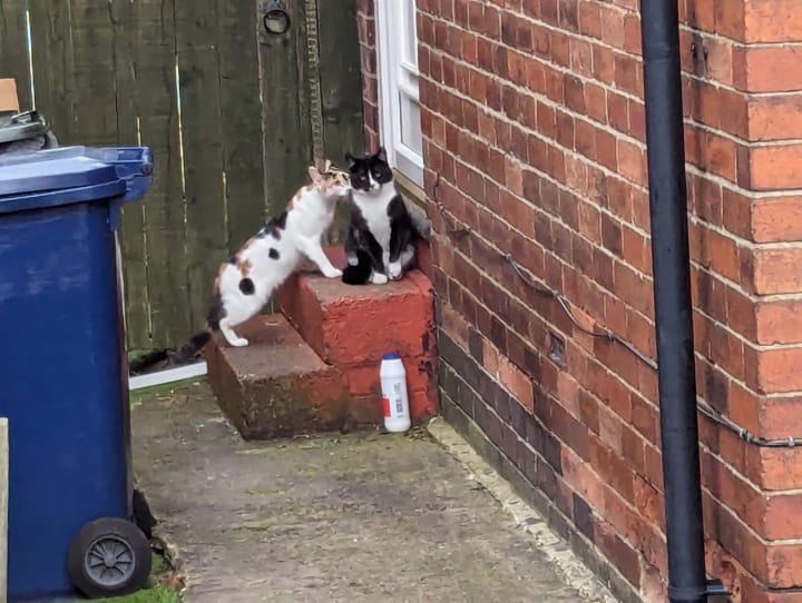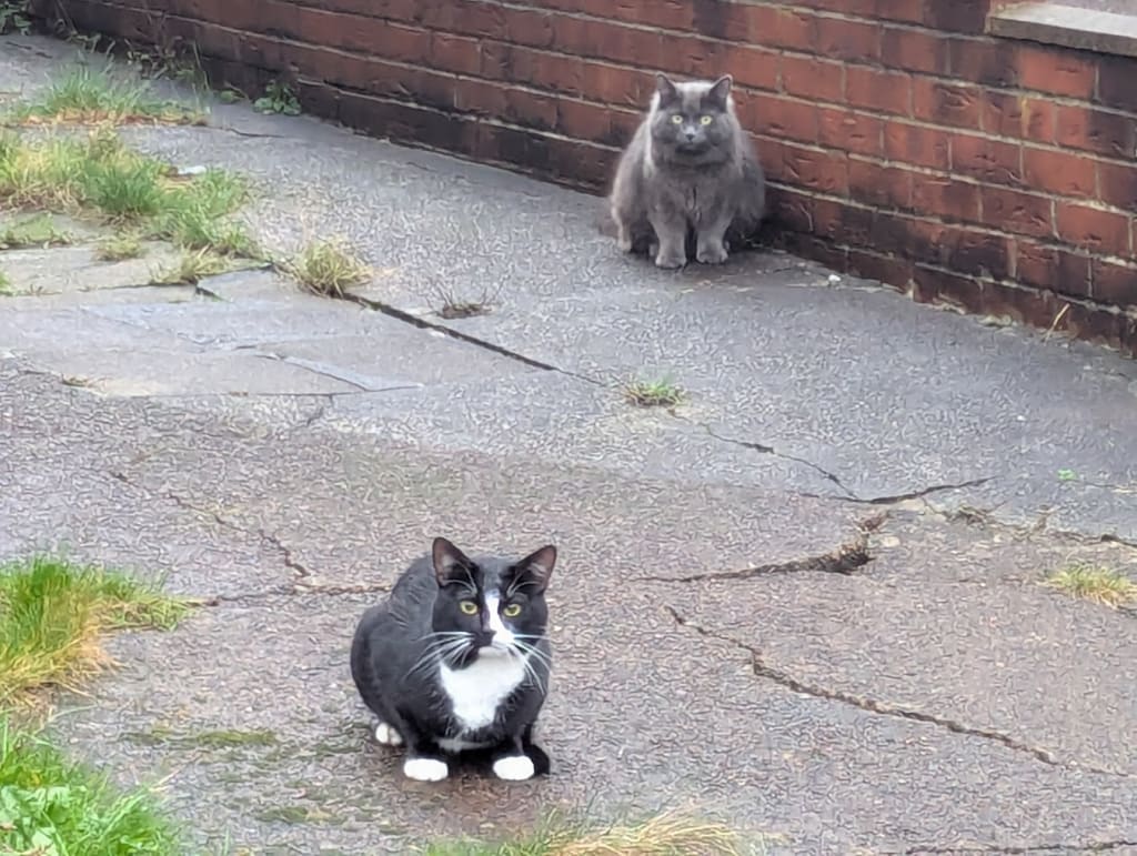 This is just another excuse to share pictures of some of the cats that I see on my walks, and that sometimes come to demand treats at my back door. There was just Mrs P at first, but now she is followed by another that finishes the treats that Mrs P leaves if the magpies and birds don't get there first.
