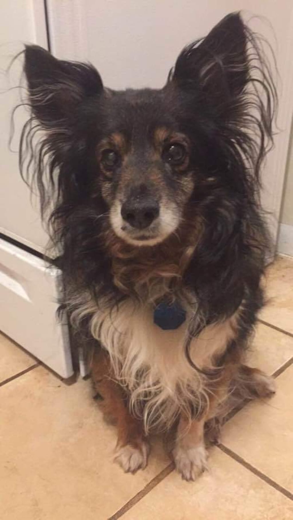 I was leery of the situation because I knew the man involved, he had a history of dog abuse. I went to check the dog out anyway. As I walk in he says, “you should let me take him out in the woods and shoot him, he’s the dumbest dog I’ve ever owned.” He shows me into the laundry room where I find this 9 month old pup tied to a shelving unit with an 18 inch piece of rope. The rope was tied around his neck, no collar. He had an old dish towel for a bed, and it was so soaked in urine that it gushed when he stepped on it. I knew at first glance that this was not a full blood Sheltie as advertised, but, at this point, it didn’t matter. This boy was not staying here.