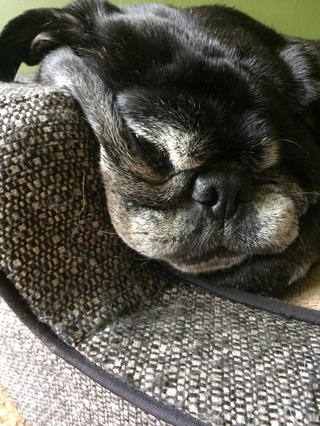 He is a sneaky little turkey who has a taste for alcohol and cannabis it turns out. Through his Facebook page, I was contacted by his rescuer who told me she had tried to keep him initially but that he and her other pug did not get along (he was likely guarding his food at the time because he had been in a neglectful situation and was underweight). She told me about how one time she had been cleaning out her freezer and came across a weed cookie that she had been given but knew she would never consume so she threw it out. They went out and when they came home later there was garbage everywhere and Kermit was sitting in the middle of the kitchen looking out of it - turns out he had snuck the cookie and needed vet care to empty his stomach. We know he’s a real party animal because one Christmas while visiting family in Guelph, he waited until everyone was distracted and then snuck around the room knocking over people’s drinks and lapping them off the floor until he was quite wasted and we caught on to his tactics. Poor man was sick and his eyes looked like he had the spins, so his Aunt, the nurse, held and comforted him. This hasn’t made Kermit stop trying to steal drinks though; any unsuspecting person who visits and tries to set down their drink usually get a slimy pug tongue in it!