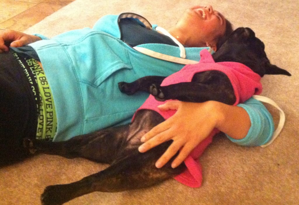 The door to your last house swung open and as if a fairy dressed in black, a buzzing bee, you flurried through table legs and under chairs to the home that was my arms. There you are, you snorted, and I scooped you to my hip- a monkey, a koala, a baby, a French bulldog, your legs wrapped around me like an infant coming back to mom. I had never fallen in love so fast, so fiercely.