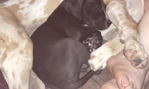 In April of 2020 we went and got April from southern Missouri. We got her from an older couple who lived down this road filled with potholes out in the middle of no where. She was so adorable and of course Mac was like "Umm, what is that thing?" He sniffed her up and down like most dogs do when they meet another dog. We didn't pay for her so I was expecting something to be wrong with her. She was covered in ticks, a ton of them. It was a two hour long car ride home and I pulled ticks off her the whole way. Then when we got home, I gave her dewormer and that same day she was pooping out dead worms. We took care of her and babied her just as much as we baby Mac. Mac learned to share with her and see her as a sister not an enemy.