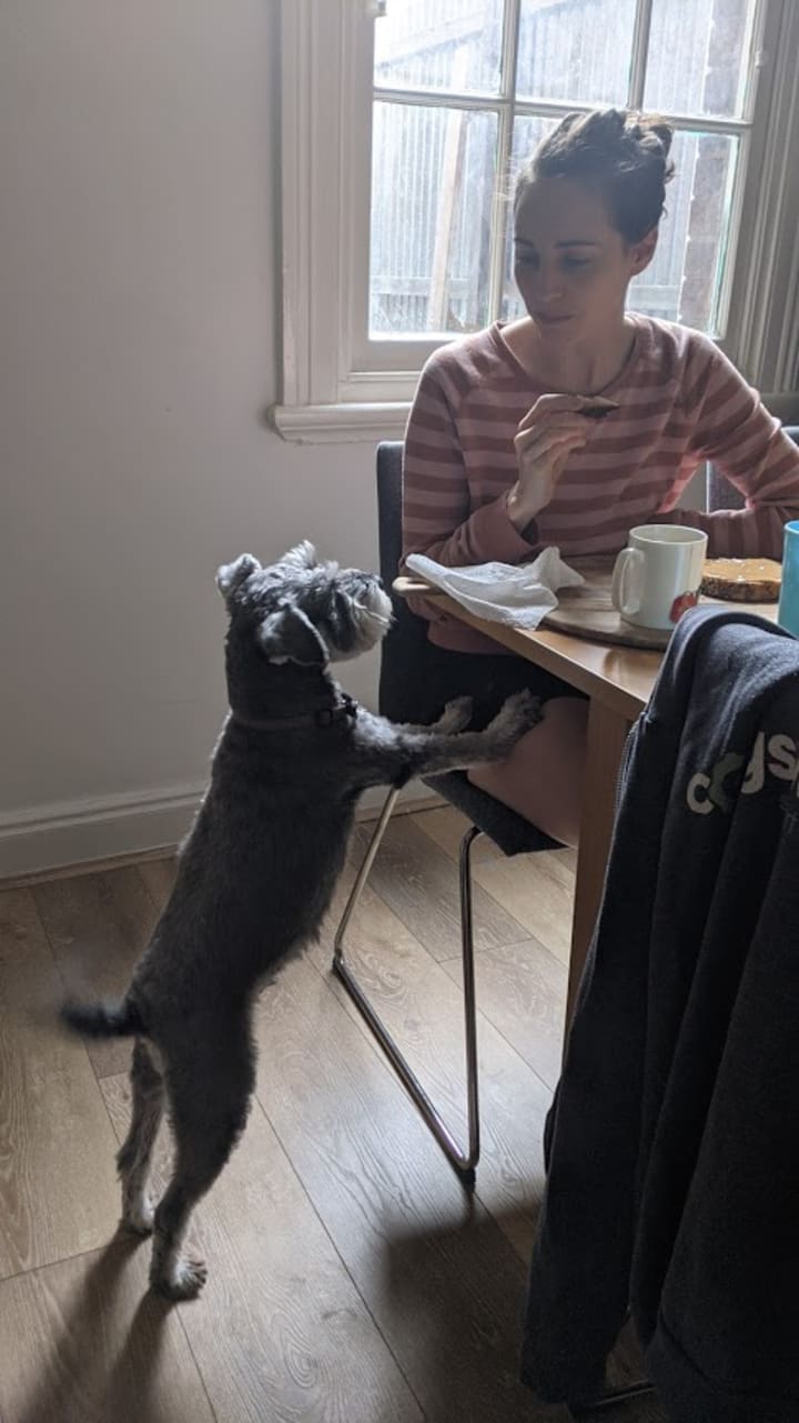 Grandma Mavis was fooled but I wasn't. Henderson often played the long game, spending what felt like hours starting at me, with a look in his eyes that practically accused me of maltreatment, of abuse, of failing to feed him, of forgetting to love him. It was a clever strategy and often worked, but not today. Pastries, vegan or not, are hardly canine appropriate.