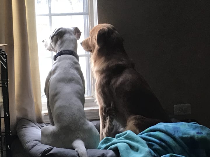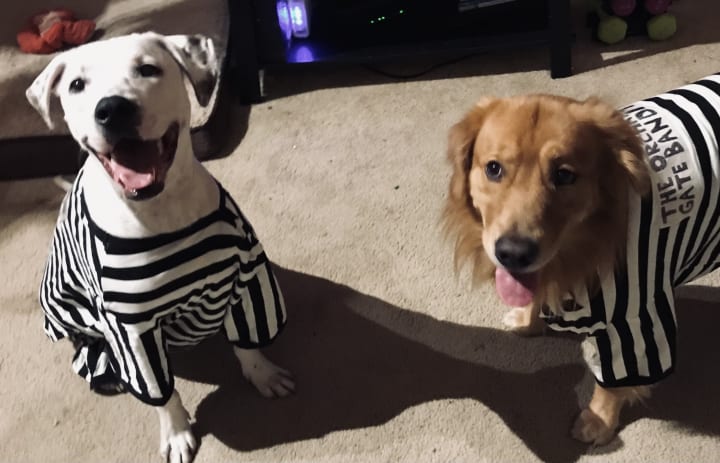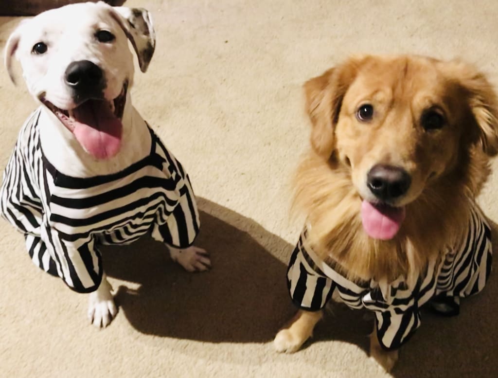 So, naturally, when Halloween rolled around, we wanted to dress them up together. We racked our brains, looking through hundreds of costume ideas on the internet. In the end, we could not think of a better plan for these partners-in-crime than to dress them up as doggy prisoners. We dubbed the adorable inmates the Orchard Gate Bandits. We trotted them around that evening, greeting and delighting the trick-or-treaters and their families. Charlie and Sammy lived up to their bandit personas as they preceded to steal not only all of the treats, but also the hearts of everyone in our little neighborhood. The pair of them together was a rare picture of pure friendship and total joy.
