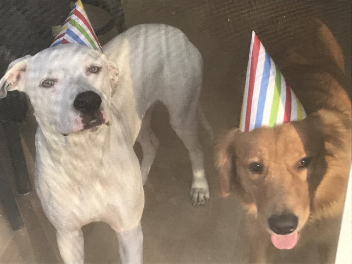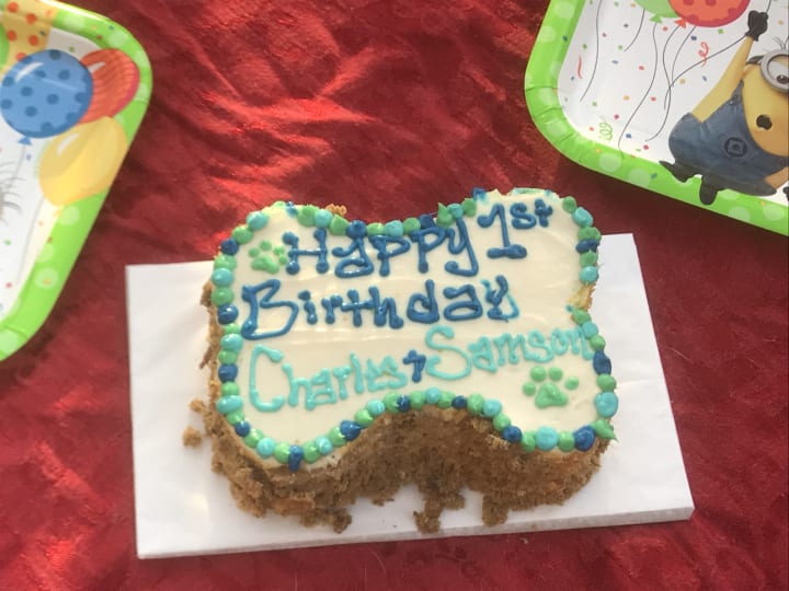 Dressing them up together for Halloween was the first of many fun holiday activities we decided to engage in with the dogs. Both boys were born in December, so we decided to have a joint doggy birthday party for them, complete with hats, matching plates, and a dog-friendly cake shaped like a giant bone.