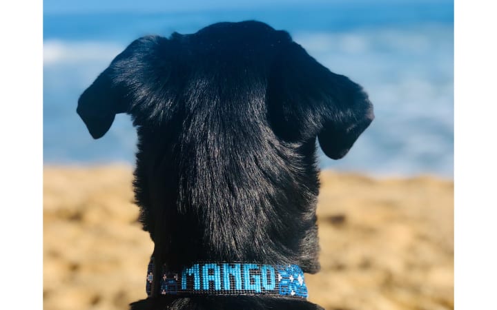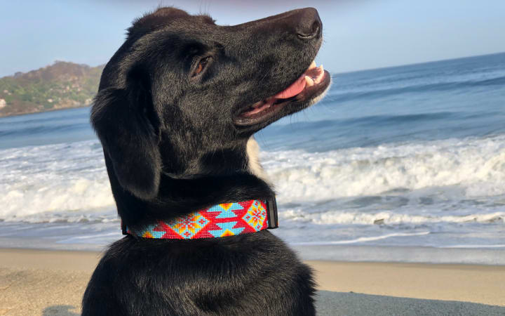 But here Mango comes, nudging my wrist from the keyboard with her cold wet nose, in her eyes an inviting smile, adorned handsomely in her Huichol rainforest collar and matching beaded harness (a prototype she is beta testing). She nudges me again, harder, batting away my melancholy, insisting I rise, shut that laptop, move forward, get Jill and together we’ll explore that glorious outside, smell and breathe in that salty fresh air, maybe hunt some squirrels through the palm trees, chase some shore birds if we’re lucky. Let's live!