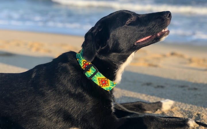 Pre-pandemic we embarked with Mango on a long coast-to-coast drive across the United States to visit surf shops and other suitably independent retailers in California, through Colorado and Nebraska and Iowa, to Brooklyn and then Florida, then back through the southern states and all the way back to Sayulita. We aimed to introduce the Huichol collars and hopefully get some orders. When allowed, Mango entered the shops with us wearing her beautiful collars, charming buyers and helping close deals. We also visited many dog parks along the way to give her some off-leash time, and Mango mingled and played and ran with dogs all over the country, through tall corn fields and crowded city parks without issue while showing off her wares. She discovered a love for chasing California squirrels, Colorado prairie dogs and even a gang of Rocky Mountain elk, hip Brooklyn dog park pups and southwestern jack rabbits.