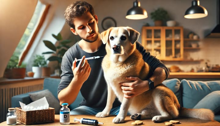 A pet owner gently injects insulin into a dog or cat in the comfort of their home.