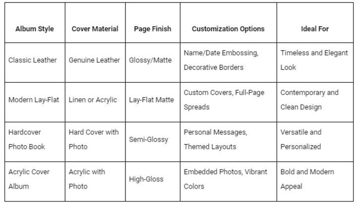 Here is a comparison of popular wedding album styles and their features: