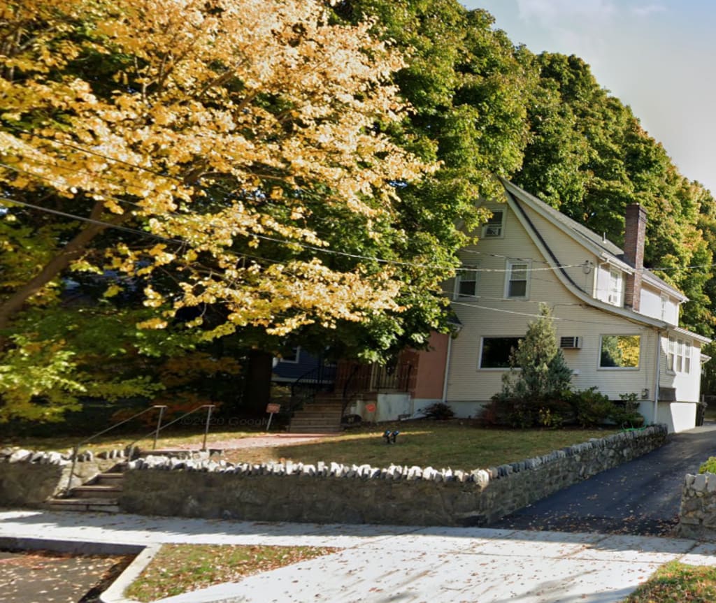 House on a main street, with leaves all around.