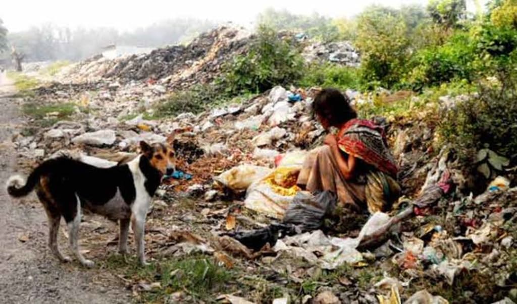 An elderly man in a tattered, faded kurta