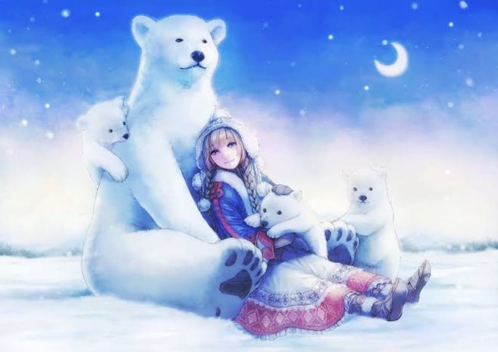 A girl with white polar bears, shining in pure white.