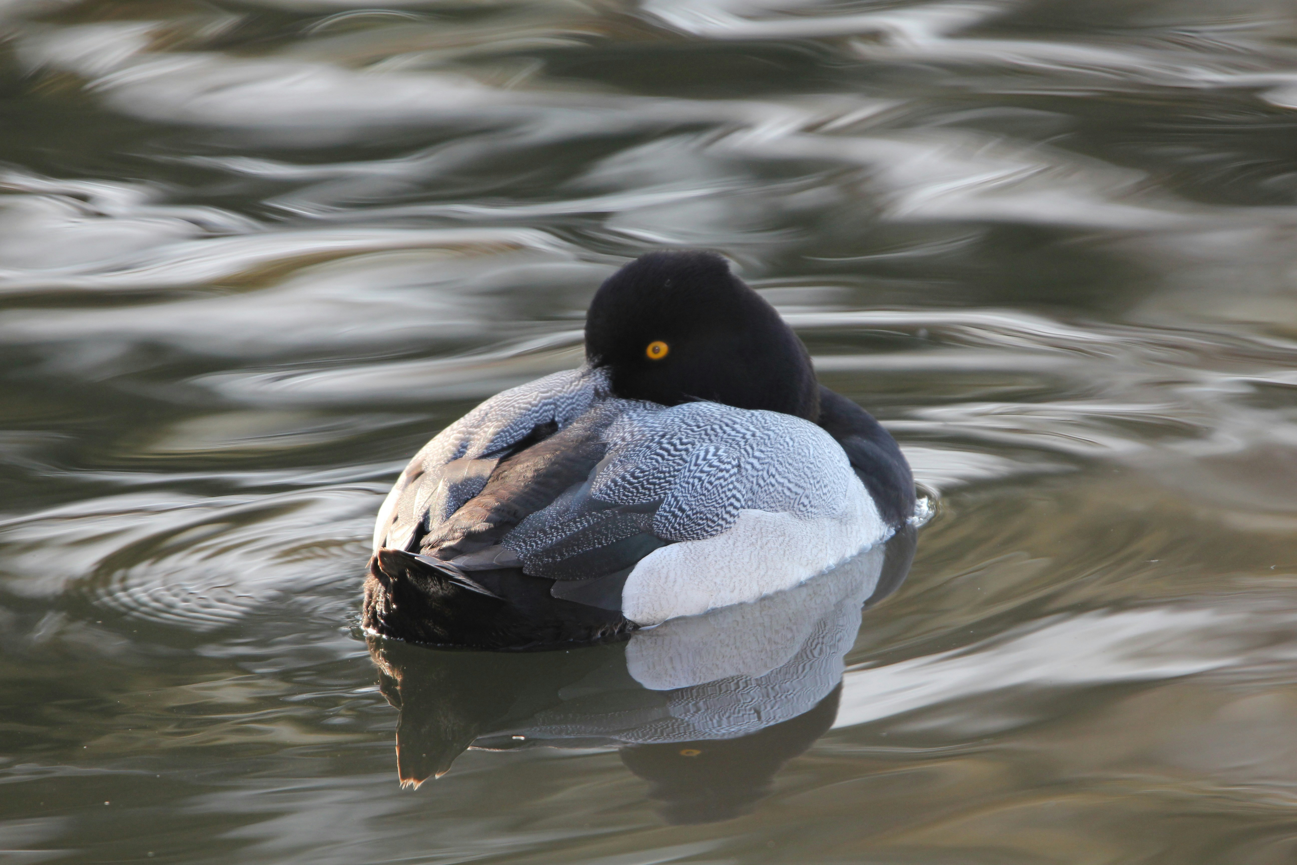 one eye gleaming, watchful still, head tucked onto his back, enjoying a carefree friendly float,
