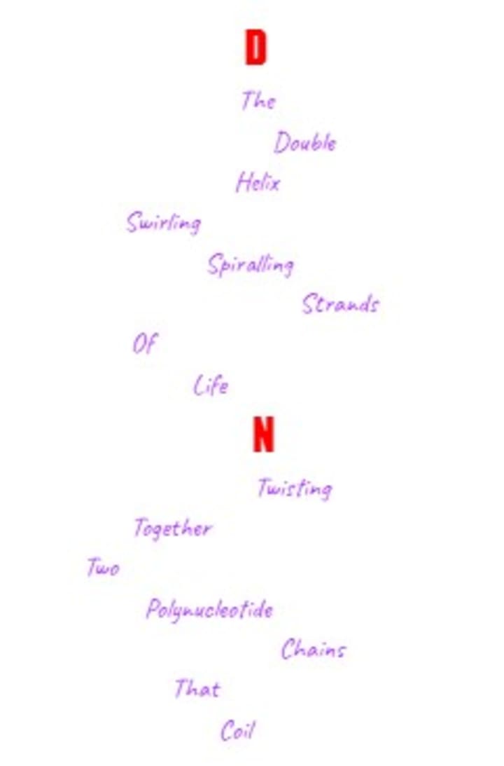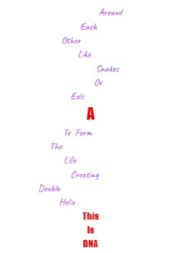 This is a visual attempt at a poem inspired by the double helix formation of DNA. The original looks much better but I have included the text for the Vocal poem entry.