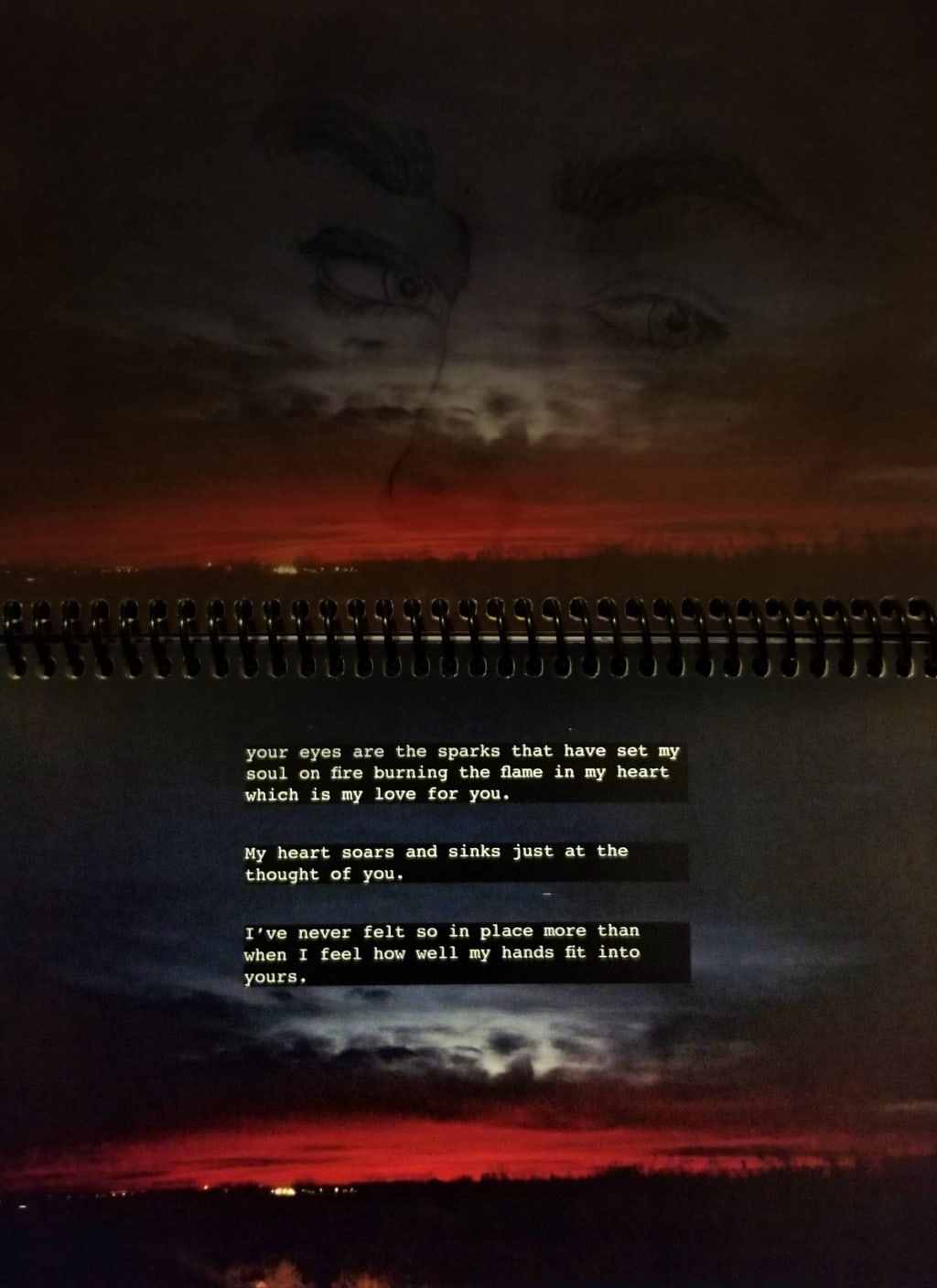 your eyes are the sparks that have set my soul on fire burning the flame in my heart which is my love for you.