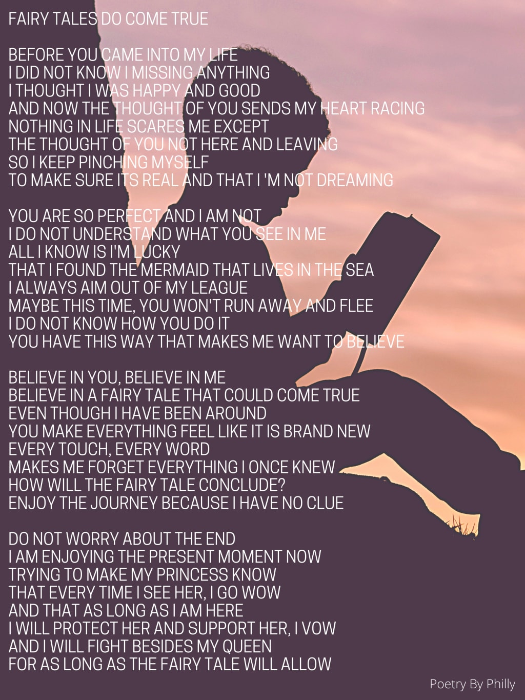 I think that this poem can be a poem that we all relate to. I think for the one giving this poem. This speaks about his or her heart and how they feel about the special person they give this to. For the receiver, this is what we want the giver to feel about them. We all want to believe in fairy tales. We all want that love that conquers all. We want to be that knight is shinning armor, or to be that princess that wants to be rescued by her knight in shinning armor. I know that the world is changing and that dating, and relationship are changing. But I think our desire to fight to save our princess or our desire that our prince will travel the world to save us still exists in our souls. If it doesn’t – I don’t want to be part of that world. This poem is dedicated to those souls.