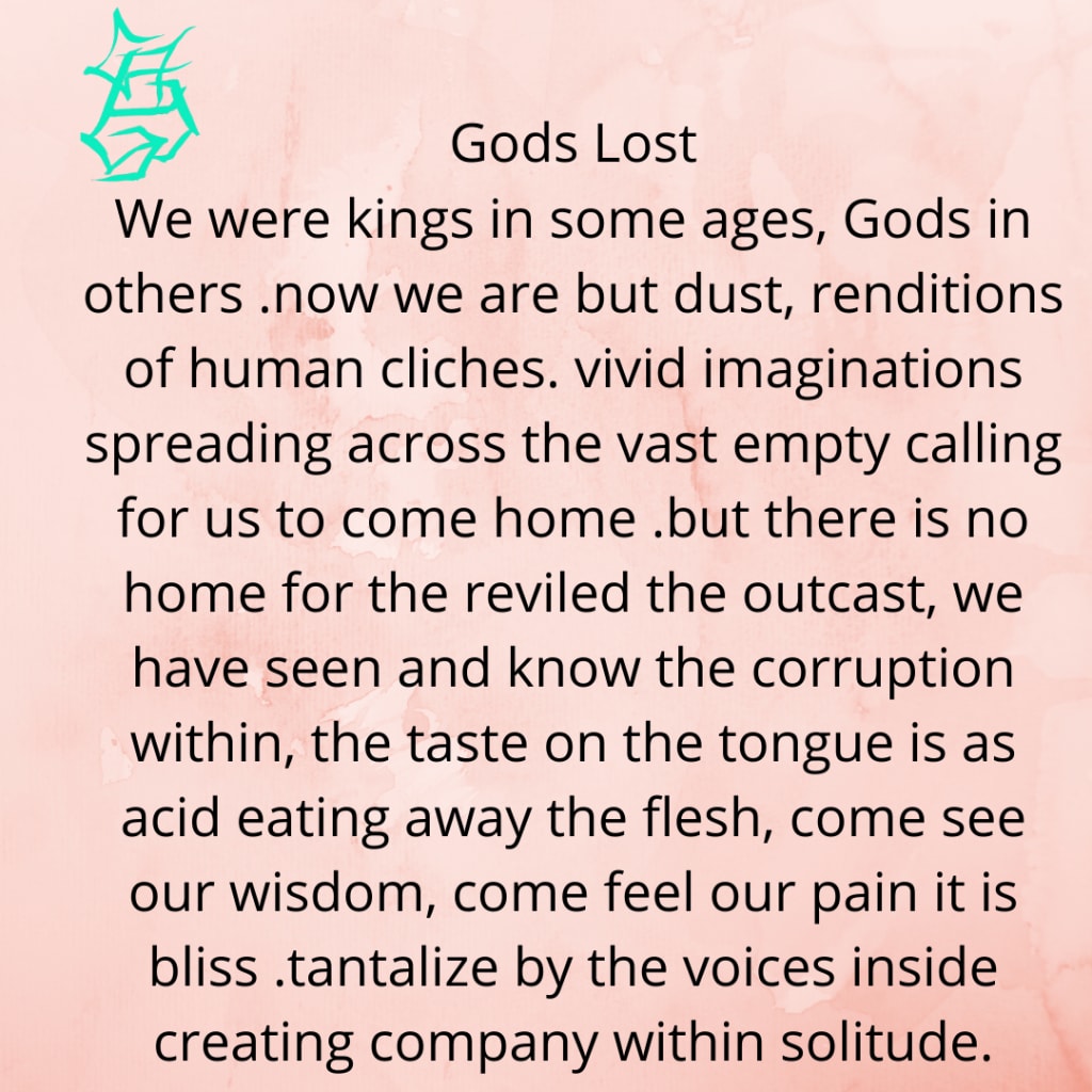 We were kings in some ages, Gods in others .now we are but dust, renditions of human cliches. vivid imaginations spreading across the vast empty calling for us to come home .but there is no home for the reviled the outcast, we have seen and know the corruption within, the taste on the tongue is as acid eating away the flesh, come see our wisdom, come feel our pain it is bliss .tantalize by the voices inside creating company within solitude.