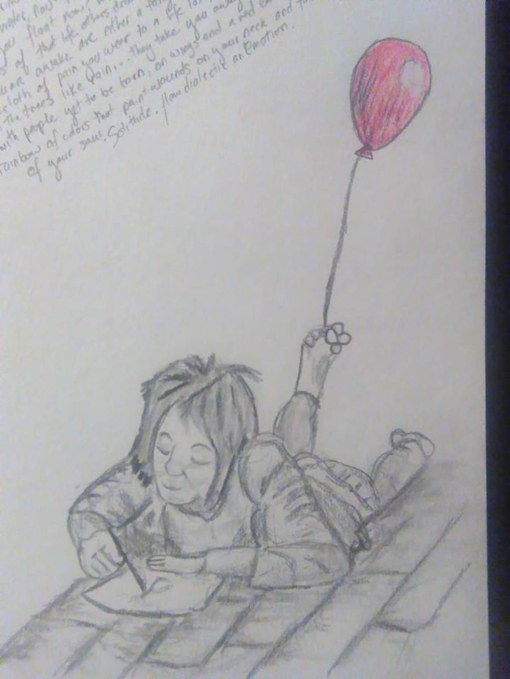 You find yourself alone with these daily leftover moments of your last, listless afternoons spent floating into the sky of dreams others dream for you. With no one left to argue or ask questions, you get used to the solitude.But with the solitude, what floats away in the merriment of people returns: sadness. A moat of dark water renders you safe in your castle. How do you float now? What saves are the fairytales and stories of the life others dream you to live. These dreams you have when you are awake are either a tangle of briars no one can cross, a sackcloth and ashes worn at the baptism of your life lost. Maybe they are colors that drip from the trees like rain. Maybe they take you away to the world you must see, with people yet to be born, on wings and a red balloon.Over the rainbow of bluebirds, colors paint wounds on your neck and fuel the candle of your soul. Solitude. How dialectic an emotion.