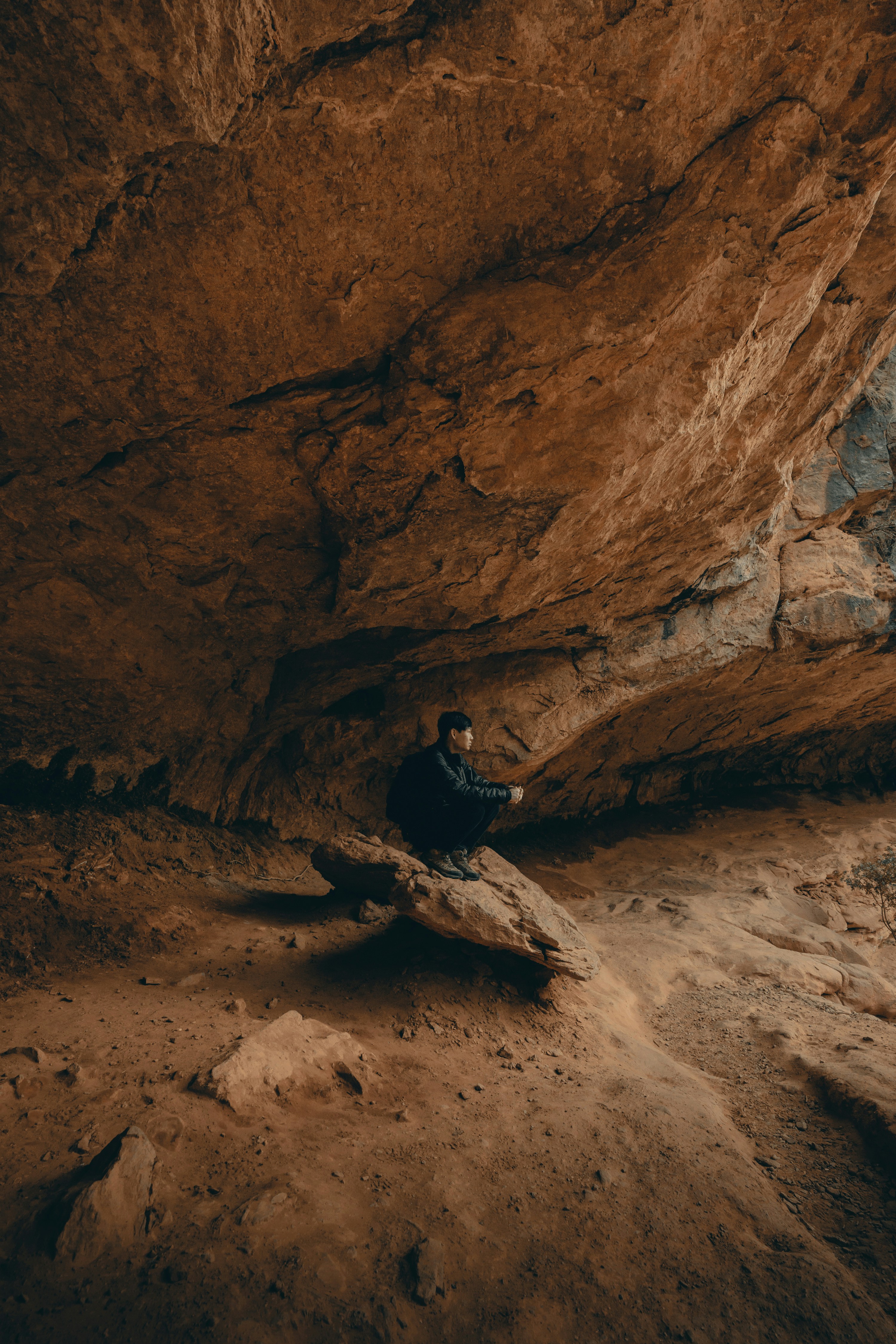 ref; A modern man sits inside an ancient cave in France.