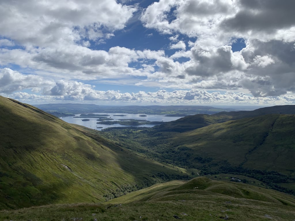 Behind me, the glassy island-studded waters of the tranquil lake shrink to miniature-size