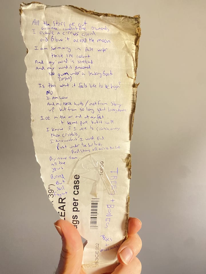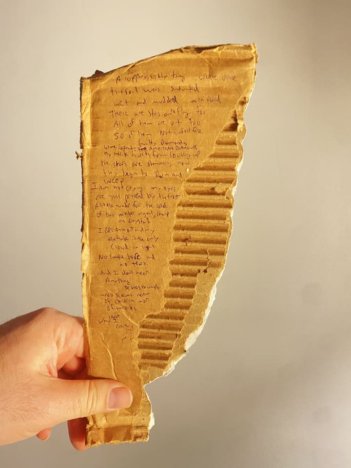 Ended up writing the first draft of this poem in my head through the day then transferring it to cardboard on my break.
