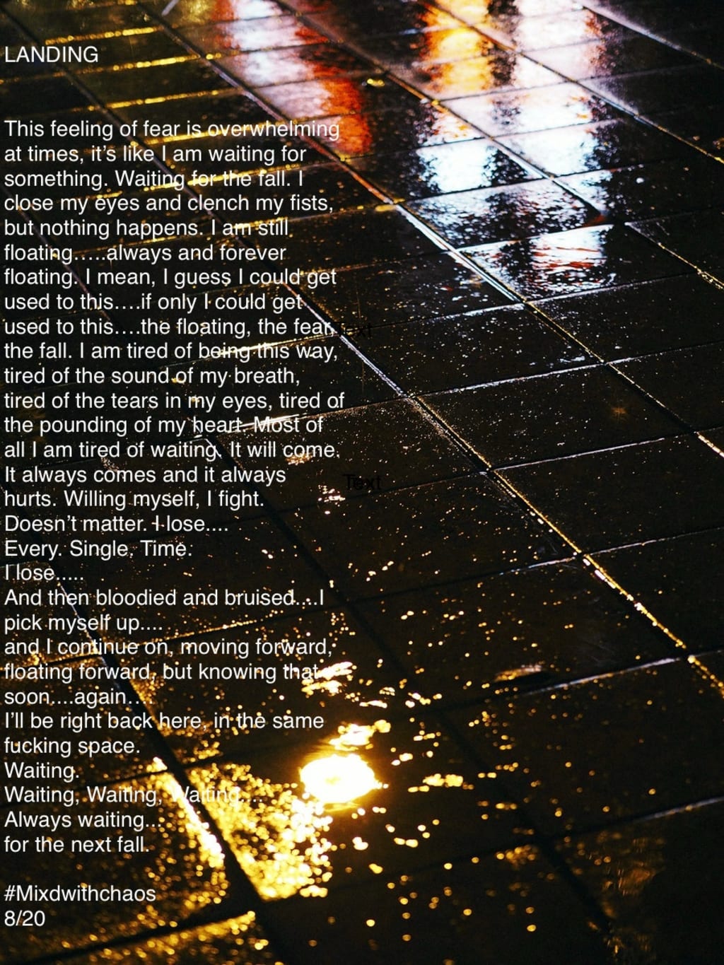 This feeling of fear is overwhelming at times, it’s like I am waiting for something. Waiting for the fall. I close my eyes and clench my fists, but nothing happens. I am still floating…..always and forever floating. I mean, I guess I could get used to this….if only I could get used to this….the floating, the fear, the fall. I am tired of being this way, tired of the sound of my breath, tired of the tears in my eyes, tired of the pounding of my heart. Most of all I am tired of waiting. It will come. It always comes and it always hurts. Willing myself, I fight.