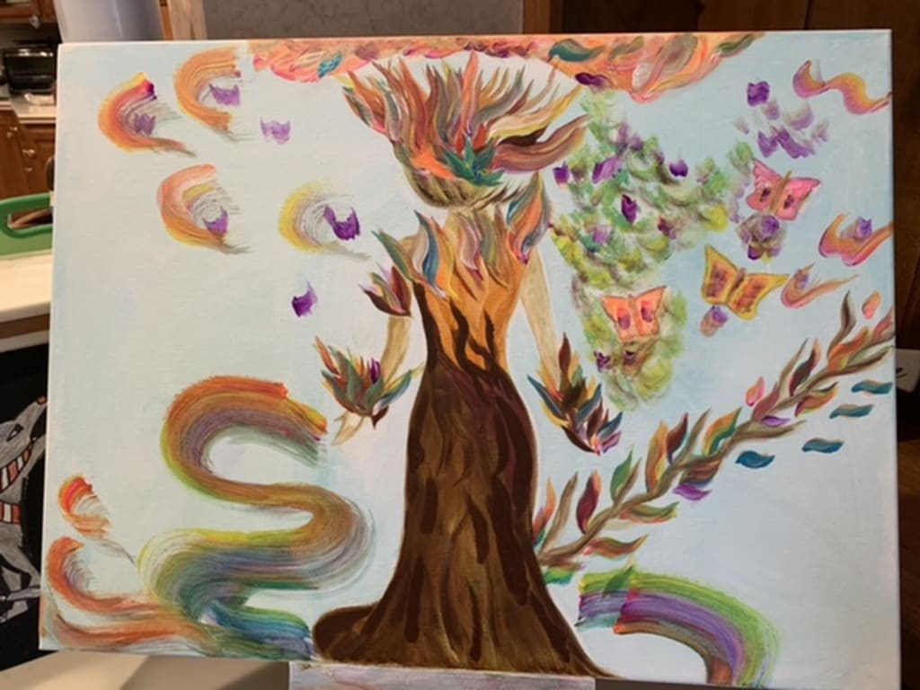 Colors are nature's way of saying .."Let us party"...Pink Yellow Green and Blue dancing around saying I love you..A tree in the middle wearing a dress especially for her to impress..Butterflies singing for mother earth painting colors on her dress..Flowers everywhere flowers in the air Yellow and Red sitting on her head..All around love is found just close your eyes and hear the sound..Sound of colors as they mingle holding the tree dancing on her knee..Violet and Orange come hold me tight just let me see you every night ..White and Pink take a drink a sip of honey from my twig..Spread love in colors all around and form a rainbow that never end..