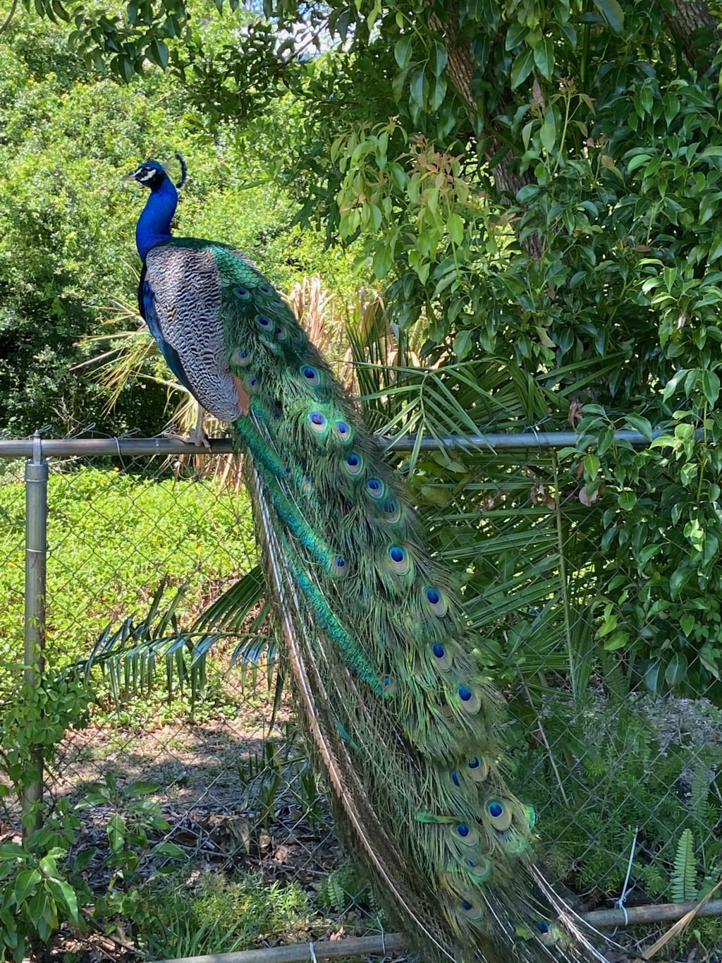 Our peacock’s got plumes that gleam iridescent,