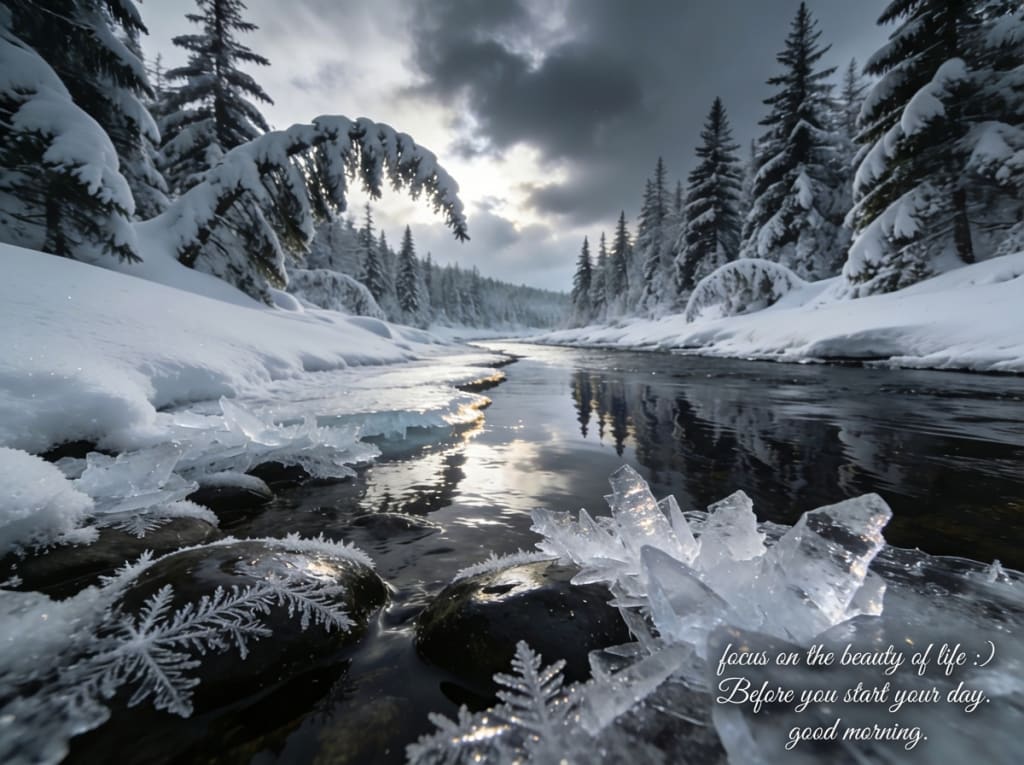 The river moves in silent, dark repose, A glassy breath between the banks of snow. The frost has traced its patterns on the stone, A whispered art that only morning knows. The forest stands in robes of quiet white, Each branch a ledge where softest crystals cling. The sky, a grey and patient veil of light, Begins to wake as if to hear the spring. But spring is far. And here, the world is still. The cold is kind, it slows the hurried mind. It asks of you a moment, just a will To see the beauty you were meant to find. So pause before the current pulls you in, Before the noise returns, the rush, the race. Let this quiet morning wash away the din, And let the light rest softly on your face. For life is in the details, small and true: The frost, the flow, the forest, and the sky. Good morning. Let this beauty see you through. Good morning. Peace begins before you try.
