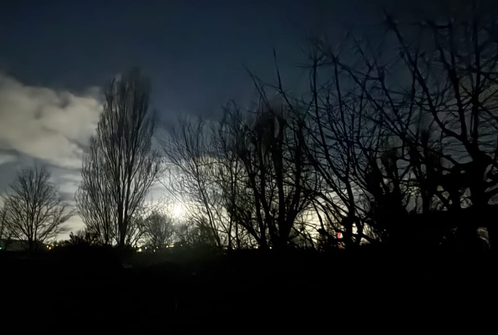 Moon setting over suburban garden, 05:00 Mar 1, 2026. Photo:RGT