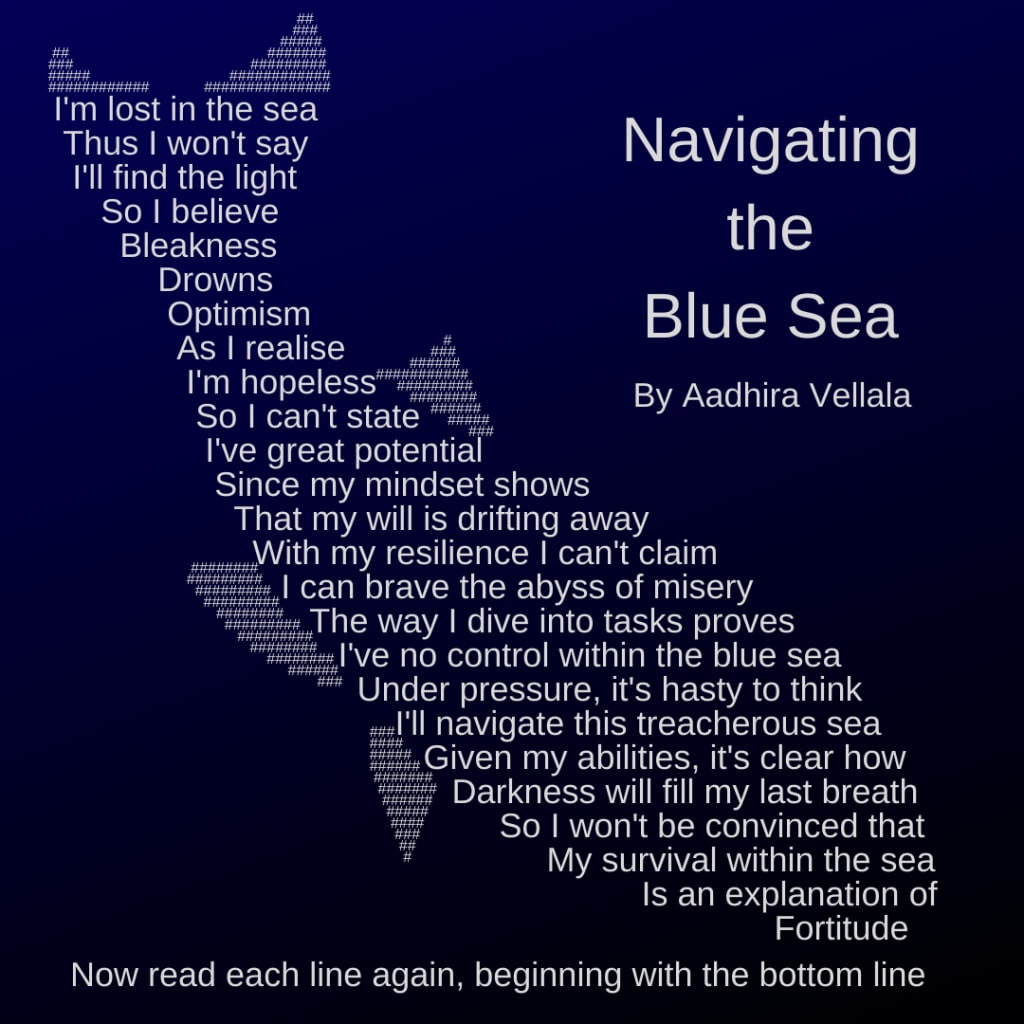 I'm lost in the sea Thus I won't say I'll find the light So I believe Bleakness Drowns Optimism As I realise I'm hopeless So I can't state I've great potential Since my mindset shows That my will is drifting away With my resilience I can't claim I can brave the abyss of misery The way I dive into tasks proves I've no control within the blue sea Under pressure, it's hasty to think I'll navigate this treacherous sea Given my abilities, it's clear how Darkness will fill my last breath So I won't be convinced that My survival within the sea Is an explanation of Fortitude