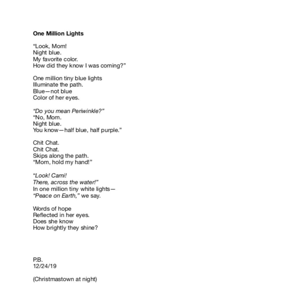 This is about my daughter, Cami, then age 10. On Christmas Eve we went (just the two of us, I am a single parent) to Busch Gardens Williamsburg, which is a theme park in our hometown. We were standing on the bridge between "Italy" and "Germany" and saw a giant sign all lit up in Christmas lights that said, "Peace on Earth." I wanted to capture that moment in words, with her pointing across the water and us standing there in a moment of awe and appreciation. She was looking at the lights; I was looking at her.