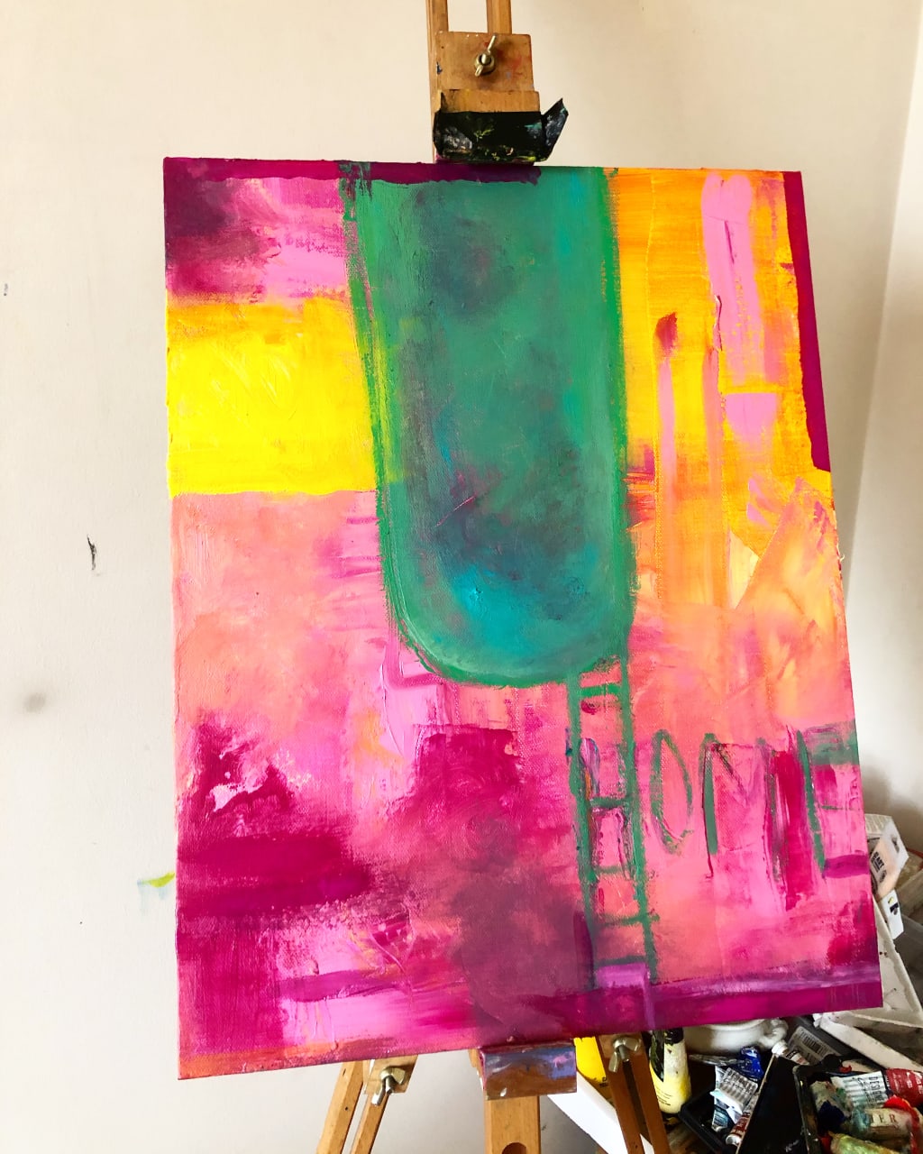 brushstrokes sweeping over the stretched canvas