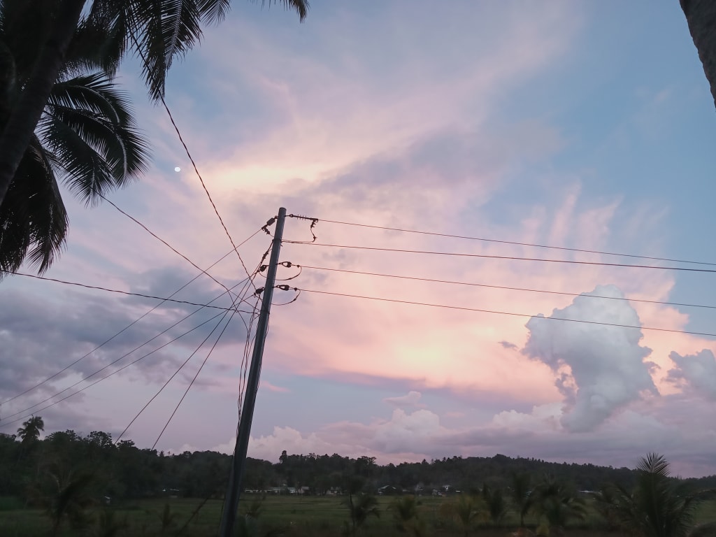 As pink clouds caress the evening air,