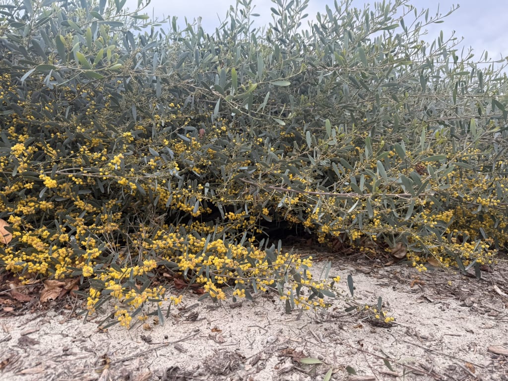 Note: Under the neighborhood acacia shrubs, cottontail rabbits live. As I stand there admiring the yellow blossoms, I see them moving beneath them.
