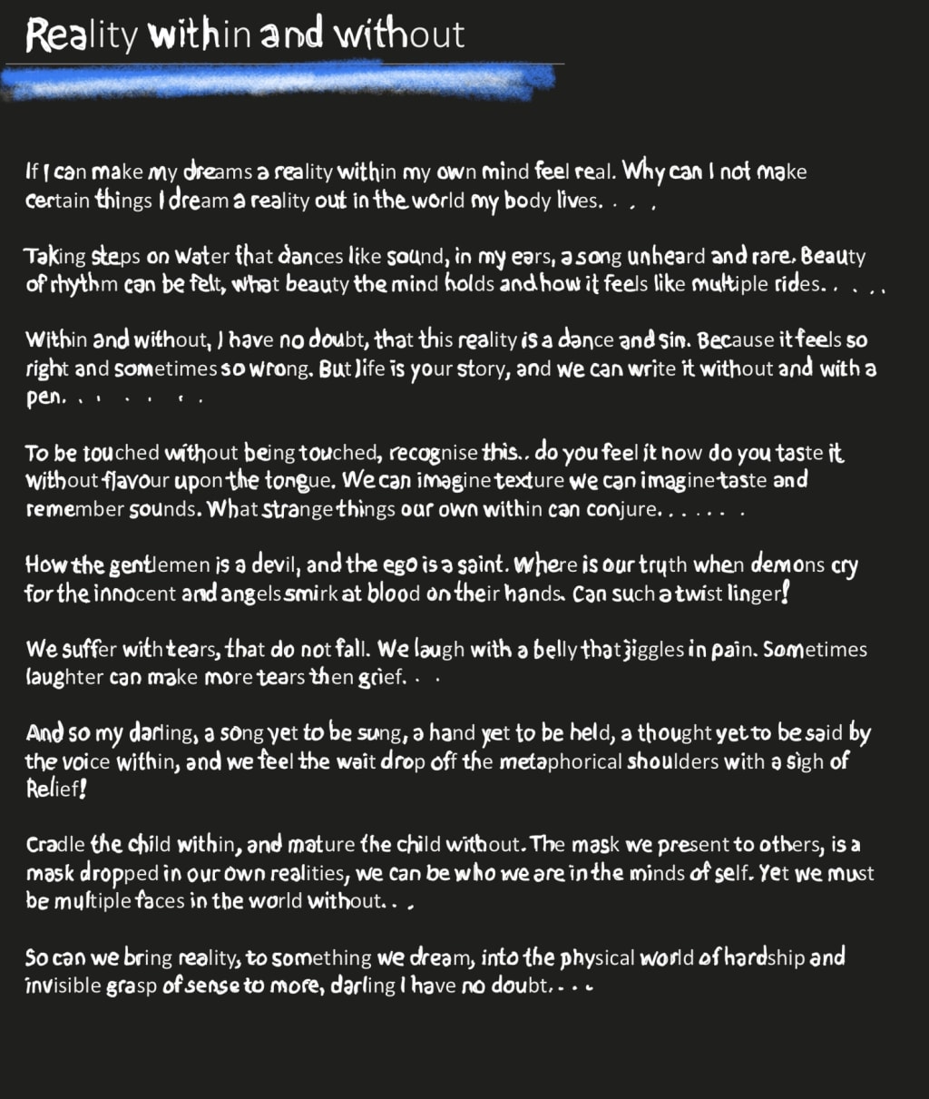 Within and without, I have no doubt, that this reality is a dance and sin. Because it feels so right and sometimes so wrong. But life is your story, and we can write it without and with a pen.