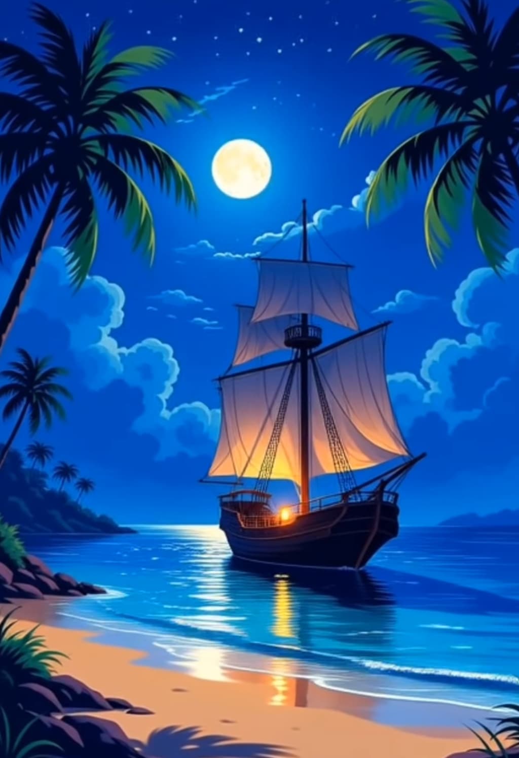 A lantern glows against the sail,